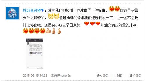 新浪娱乐之后独家连线《挑战者联盟》节目组,节目组表示,孩子妈妈已出面澄清自己先前不了解的情况,向冰冰道歉!“冰冰只是刚好在明星的光环下做了一件普通人都会做的事,请大家用单纯的眼光给好人一个掌声,社会需要冰冰这样的正能量,也祝小朋友早日康复。”