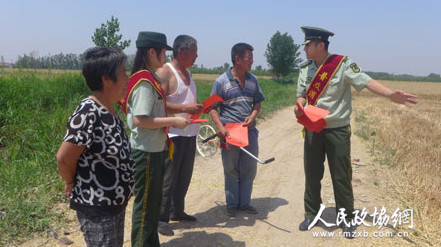 为切实预防和减少麦收火灾,连日来,山东省乐陵市政协联合市消防大队专门成立麦收防火宣传小组,张贴标语横幅70多条,宣传资料1200余份,走乡村、进麦田、到地头,深入宣传麦收防火、灭火知识,全力做好麦收防火灭火安全工作,确保农民小麦颗粒归仓。 肖俊勇 摄