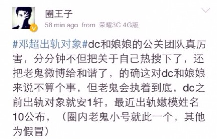 微博认证为北京日报社娱乐主编的“圈内老鬼”昨晚爆料称,“哎!又一跑男出轨了。”稍晚,更多的自媒体公众号发出消息,写道“邓超!”“大家对邓超的印象怎么样?”似坐实爆料中出轨男星为邓超。多个账号还对出轨对象进行了爆料,“长腿胡兵”称“他之前出轨的是台湾女艺人,这次是嫩模”,还有微博直指邓超出轨江一燕。随后,多个博主发文称半夜接到电话,被要求删除微博。
