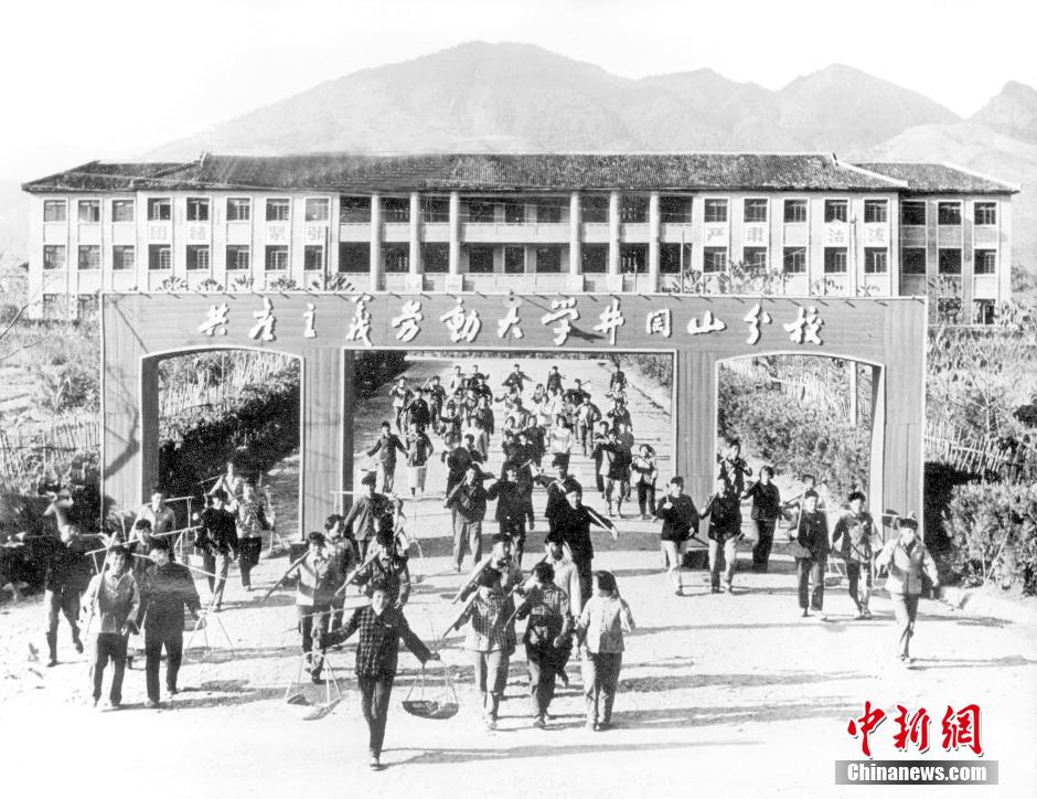 新中国成立后,学位服一度被视为“形式主义”而取消,那时我国也没有建立和实行学位制。图为江西共产主义劳动大学井冈山分校的学生走出校门,去田间劳动。 中新社发