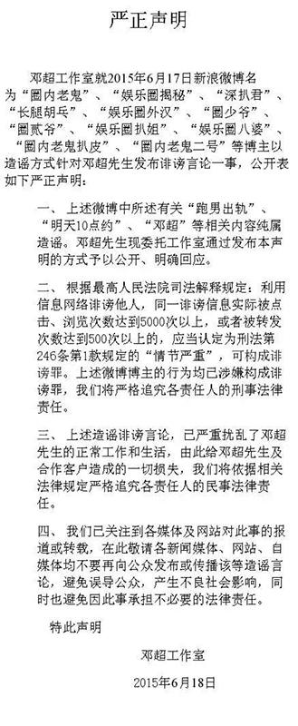 邓超工作室就2015年6月17日新浪微博名为“圈内老鬼”、“娱乐圈揭秘”、“深扒君”、“长腿胡兵”、“娱乐圈外汉”“圈少爷”、“圈贰爷”、“娱乐圈扒姐”、“娱乐圈八婆”、“圈内老鬼扒皮”、“圈内老鬼二号”等博主以造谣方式针对邓超先生发布诽谤言论一事,公开发表如下声明: