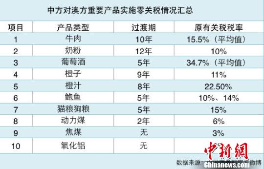 来自商务部官方微博的消息显示,目前奶粉高达10%的关税,将在协定生效后12年内取消,并且设定了保障机制;活动物出口10%的关税将在4年内取消;牛肉12%-25%的关税将在9年内取消;鲍鱼10%-14%的关税在5年过渡期内取消。