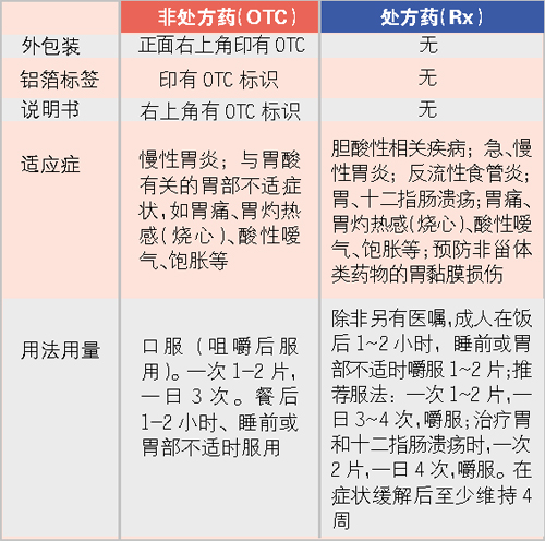 司徒冰介绍,主要通过两者的外包装、标签、说明书和适应症进行区分。以某一品牌的铝碳酸镁片为例,两者的相同之处:成分均为铝碳酸镁。不同之处则见下表:
