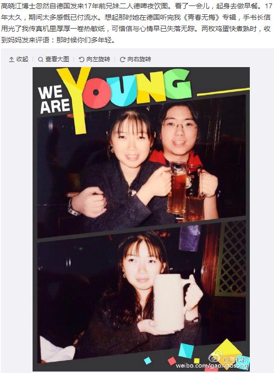 中新网6月19日电 昨晚,高晓松在微博晒出与妹妹17年前的合照,称:“高晓江博士忽然自德国发来17年前兄妹二人德啤夜饮图??戳艘换岫?,起身去做早餐。17年太久,期间太多感慨已付流水。想起那时她在德国听完我《青春无悔》专辑,手书长信用光了我传真机里厚厚一卷热敏纸,可惜信与心情早已失落无踪。两枚鸡蛋快煮熟时,收到妈妈发来评语:那时候你们多年轻。”