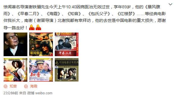 知名导演谢铁骊今天上午因病离世,享年89岁