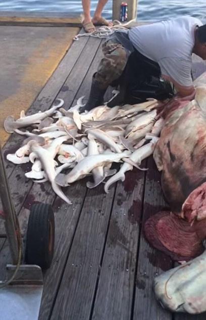 在视频中,可以听到有其他路人在场,其中一个女人在边上数着被取出来的小鲨鱼数量,最后数完一共34只?;固接行┤嗽谑悠道镄ψ牛硗庥懈雠嗽诒г刮兜捞?。