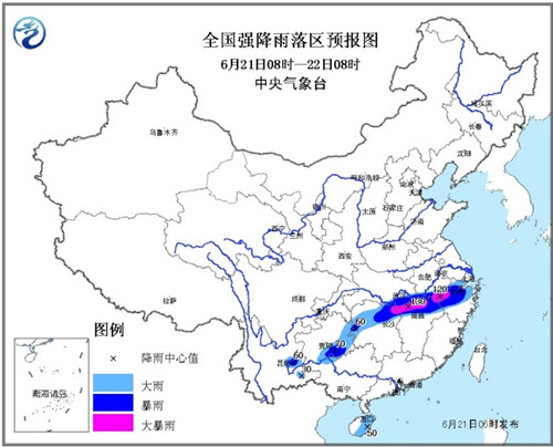 预计,21日08时至22日08时,云南东部、贵州南部、湖南北部、湖北东南部、江西北部、安徽南部、浙江北部、海南东部等地的部分地区有大到暴雨,其中湖南东北部、江西北部、安徽南部、浙江西北部等地的局部地区有大暴雨(100~130毫米);上述地区并伴有短时强降水(最大小时雨强30~50毫米,局地超过70毫米),局地有雷暴大风等强对流天气。为此,中央气象台6月21日06时继续发布暴雨蓝色预警。
