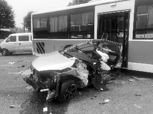 马自达轿车遭撞击后又撞了公交车,车身四分五裂 通讯员供图马自达轿车遭撞击后又撞了公交车,车身四分五裂 通讯员供图