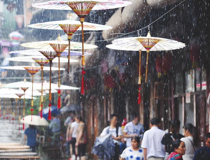 6月20日, 游客在赤水市大同古镇雨中漫步, 端午雨水让大同古镇别具风情。 记者 赵惠 摄