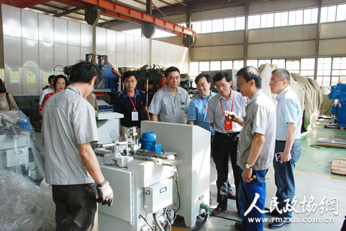浙江省舟山市普陀区以腾龙换鸟,空间换地,机器换人,电商换市的“四换三名”工程作为经济转型升级重要抓手,连日来区政协积极出谋划策,帮助企业解决难题?;贫荡葱拢际醮葱?,商业模式创新和要素配置方式创新,极大缓解了企业用工难的问题,提高了生产效率。图为区政协常委正在实地视察。 陈桂珍 丁文宏 摄影报道