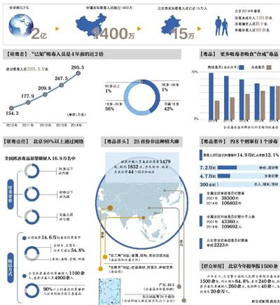 明天就是“国际禁毒日”,24日中国国家禁毒委员会副主任、公安部部长助理刘跃进和公安部禁毒局局长胡明朗在国务院新闻办公室发布《2014年中国毒品形势报告》,这是中国政府首次对外发布的毒品形势报告。当天下午,市禁毒办联合市政府新闻办召开了“北京市禁毒工作新闻发布会”介绍北京当前的毒情形势和禁毒工作。最高法、北京高院当天也发布去年毒品案件数据。根据各政府、司法机构发布数据显示,目前我国实际吸毒人员超1400万,这意味着全国100人中有1人吸毒。其中北京登记在册吸毒人员已达3万余名。毒品的滥用,以及网络成为制毒贩毒的重要平台,预计我国毒品形势在一段时期内仍处于犯罪多发期,北京毒品犯罪也仍呈现高发态势,为此去年以来,北京市法院坚持依法从严惩处毒品犯罪,先后审判了李代沫、尹相杰、陈祖名、张默等人涉毒刑事案件,有效震慑犯罪。