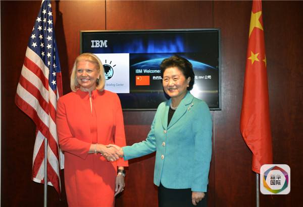 中国国务院副总理刘延东23日到访国际商用机器公司(IBM)华盛顿办公点与公司总裁金尼·罗梅蒂举行会谈。 新华社记者王雷摄