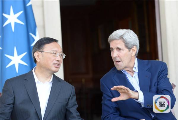 中国国务委员杨洁篪(左)22日在美国弗吉尼亚州弗农山庄与美国国务卿克里出席活动。 新华社记者殷博古摄