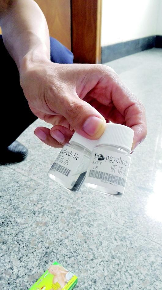 民警展示嫌疑人销售的“听话水”和“乖乖水”。记者 杜洪雷 摄