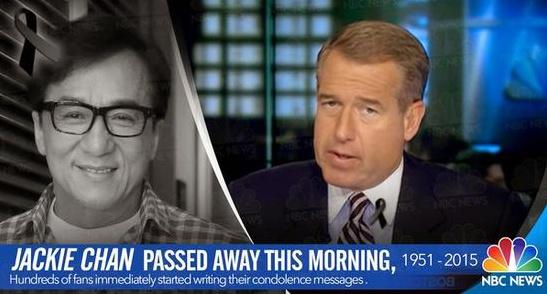 根据CNM新闻网站报导,成龙15日早上心脏病发在香港医院病逝,而她的妻子林凤娇随后在媒体证实死讯,还说葬礼时间尚未决定,但会葬在他的父母旁边。该新闻写得绘生绘影,又附上NBC主播报导的截图,提高新闻的可信度,不过新闻随后被证实是个假消息。
