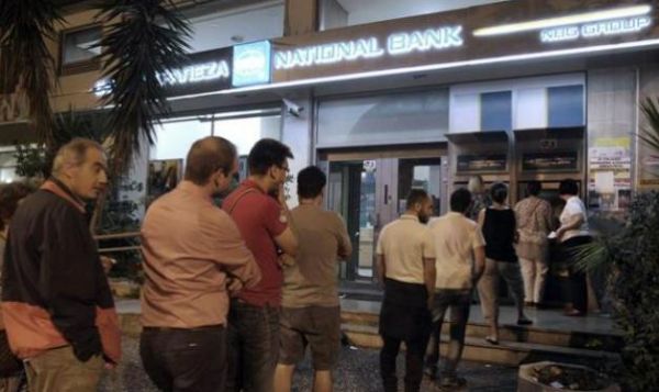 齐普拉斯27日凌晨在电视讲话中宣布,希腊将就当日与债权方可能达成的方案举行公投。当日凌晨,一些感觉前景不明朗的希腊人,即到自助取款机边排队取现。(埃菲社)
