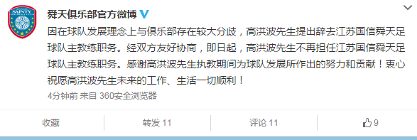 舜天官方公告:因在球队发展理念上与俱乐部存在较大分歧,高洪波先生提出辞去江苏国信舜天足球队主教练职务。经双方友好协商,即日起,高洪波先生不再担任江苏国信舜天足球队主教练职务。感谢高洪波先生执教期间为球队发展所作出的努力和贡献!衷心祝愿高洪波先生未来的工作、生活一切顺利!