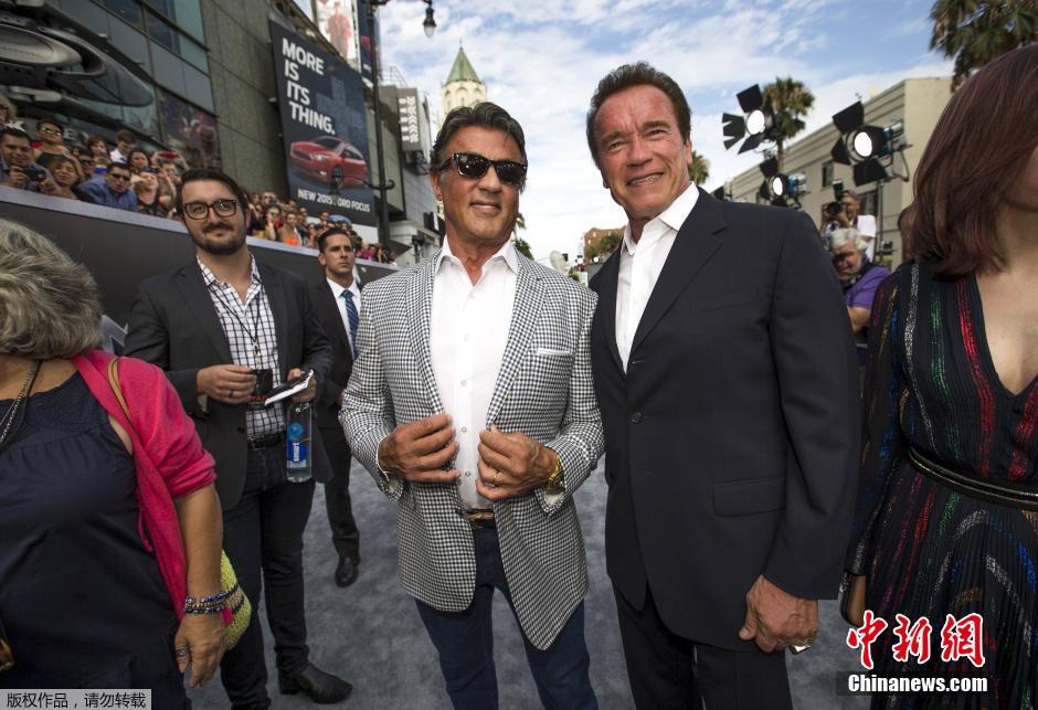 图为施瓦辛格与史泰龙在首映式上。
