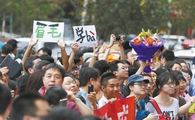 在海淀区的北京八一中学校外,高考结束后,有人高举学霸等标语迎候考生出场。新京报记者 薛珺 摄