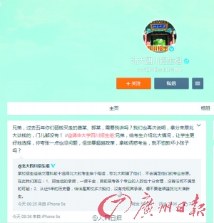 @北大四川招生组:某校招生组给文理科前十选择北大的考生挨个打电话,称北大欺骗了他们,不会满足他们的专业志愿。在此我们回应:1.招生组的承诺,一诺千金,目前报考各个专业的人数也十分合理,没有任何不满足的可能;2.从近5年的历史看,恰恰是某校多次毁约,没有兑现其承诺。请不要继续骚扰北大准新生。