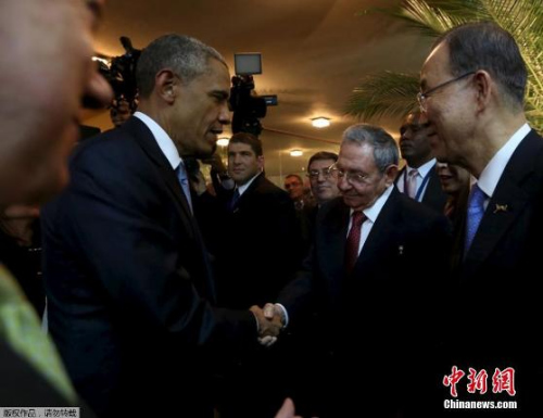 当地时间2015年4月10日,美洲峰会在巴拿马开幕,美国总统奥巴马与古巴总统劳尔·卡斯特罗互致问候并握手。