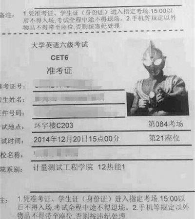 中国计量学院测试工程分院的翟同学,之前他把教务系统上自己个人信息的照片改成了奥特曼。没想到,学校是用教务系统上的头像作为英语六级准考证照片,等翟同学拿到六级准考证时,准考证上的头像成了奥特曼,当时就傻眼了。