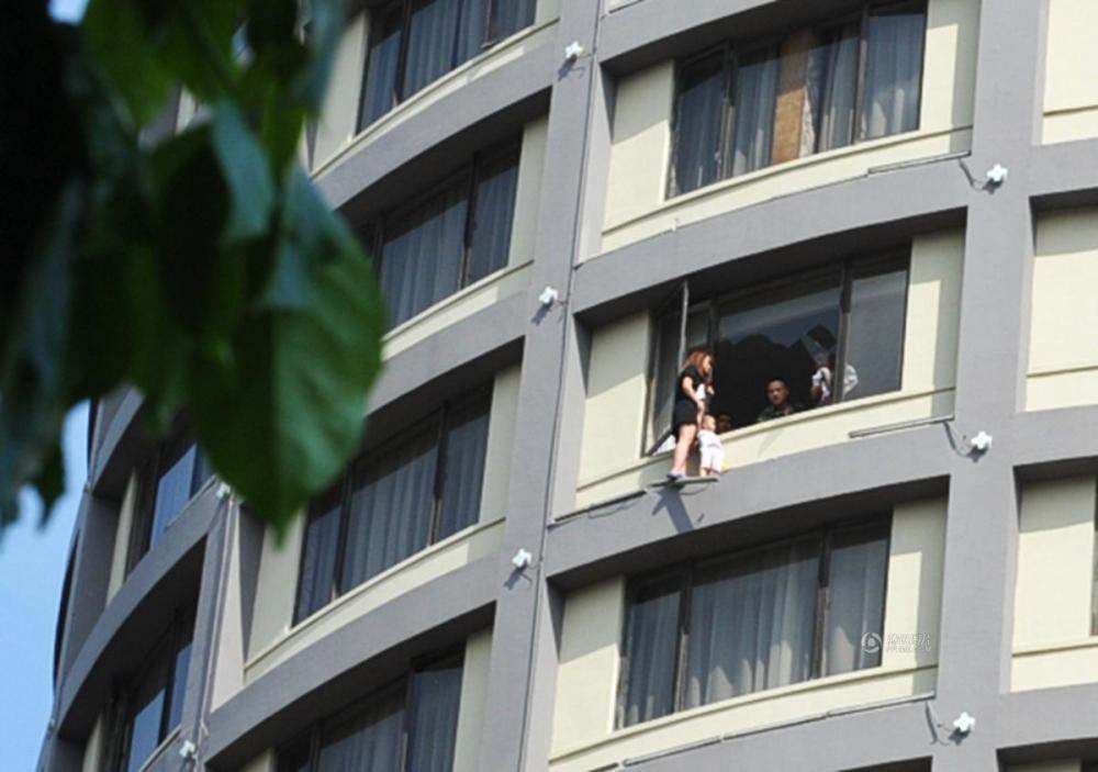 6月29日,广西桂林市市区一女子带着2岁的女儿爬到一酒店的13层楼的窗户外,准备跳楼。随后,救援人员立即赶到。女子带着2岁的女儿站在13层路的窗户外,炙热的阳光下,和救援人员对峙。女子时而激动地拉着女儿悬在半空中,引得围观市民一阵担心。铭鑫/CFP (来自:新华网)