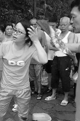 王丹萍满头大汗,旁人用扇子给她扇风。