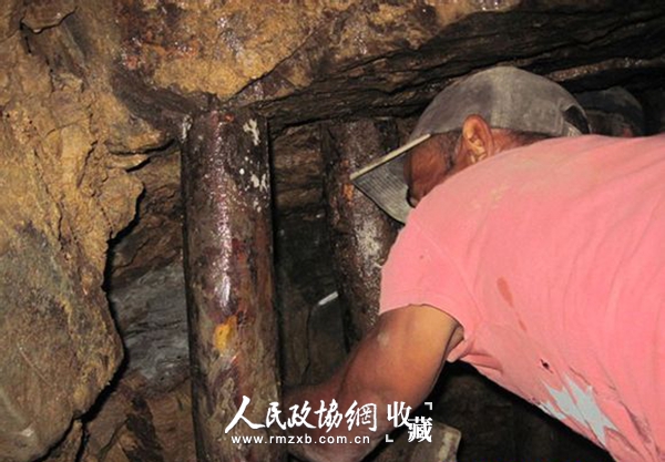 工人在坑道中开采琥珀