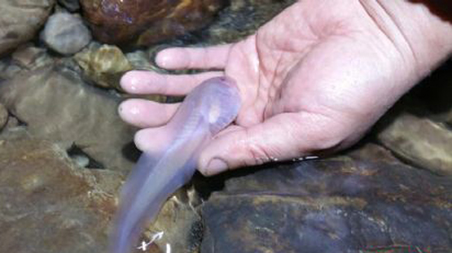 据悉,红点齿蟾为稀有两栖动物,该物种主要分布于海拔1000-1790米的石灰岩洞穴及周边地带,《中国物种红色名录》将其列为易危物种。红点齿蟾幼体大多栖于石灰岩溶洞内的溪流中,在洞内长期无光条件下生活,皮肤颜色透明,内部器官清晰可见,也叫棒头鱼或透明鱼。如将它置于光亮处饲养,体色渐深,呈紫色发展,内脏不易看清。