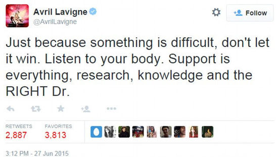 在6月27日,艾薇儿在推特上对粉丝表示鼓励:“支持代表一切,其中包括研究、知识和适合的医生。”