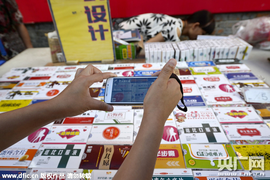 河南洛阳,老城丽景门内,一个打着“灵丹妙药”招牌的摊位吸引不少市民、游客围观,摊位上出售有脑残片、逗比口服液、蛋疼含片、学霸补脑丸、卖锰咀嚼片、含笑半步癫、牛B低调丸、贱男消失片、后悔药等标识包装的食品。据摊主介绍,这些名字各异的包装盒内,装的其实都是奶片,盒子是她自己创意设计的,受到不少年轻市民、游客的喜欢。