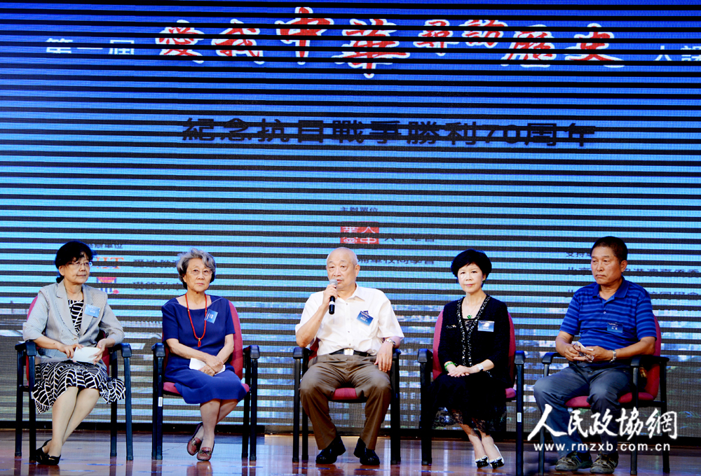 郭沫若委员长之女郭平英(左一)、周恩来总理侄女周秉德(左二)、陈赓大将之子陈知建将军(中)、胡靖安将军之女胡葆琳(右二)、冯志安将军之孙冯强(右一)?;毓烁副脖<椅拦睦?。人民政协网记者 田福良/摄