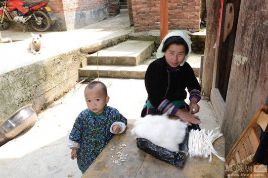 一名妇女带着孩子在自家的门口搓棉花,准备用来纺纱织布。