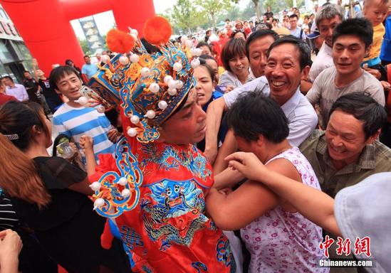 7月5日,在天津市南开区上谷商业街上,一家以蒙古风情为主调的“串吧”举行开业典礼。前来助阵开业庆典的“财神爷”在发放“金条”时,被寻彩头的民众“哄抢”,“金元宝”不知所踪,场面十分搞笑。该“串吧”携手天津纯公益基金,打造国内首家慈善串吧,将长期开展公益事业,将顾客消费之十分之一,用于贫困地区助学助教。中新社发 张道正 摄