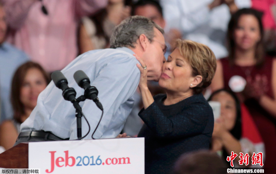 当地时间6月15日下午,美国前总统小布什的弟弟、佛罗里达州前州长杰布·布什在迈阿密的戴德学院举行宣布仪式,正式加入选战。图为杰布·布什亲吻他的妻子。
