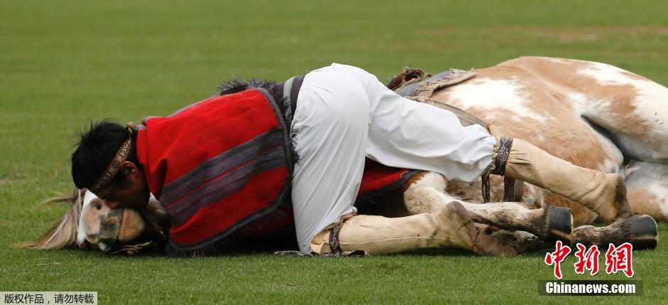 当地时间2014年9月9日,在布宜诺斯艾利斯,一名叫马丁.塔塔的马术师和他五岁的马在马球俱乐部的牧场进行表演。塔塔介绍,他拒绝使用暴力的方式训练马匹,更提倡用耳语,亲吻或者抚摸建立起人和马之间的和谐关系。