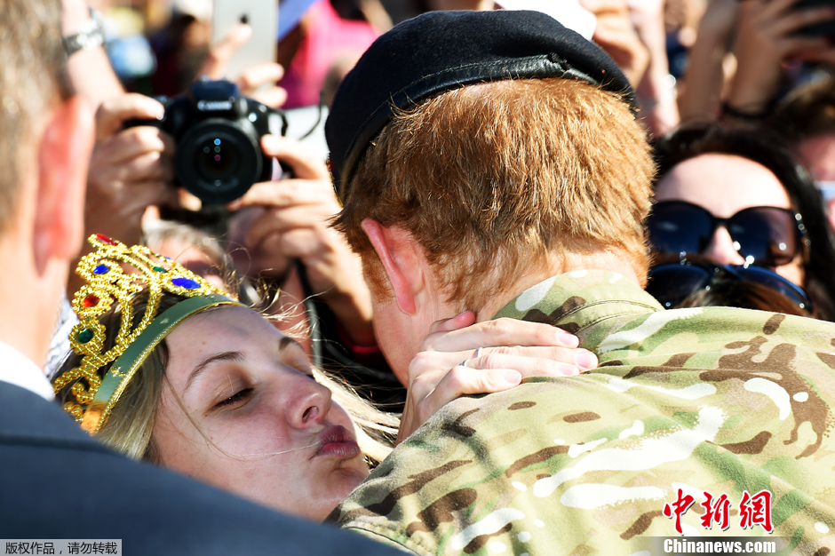 当地时间2015年5月7日,澳大利亚悉尼,英国哈里王子完成在澳洲的服役任务,他参观悉尼歌剧院受到民众的热情欢迎,并获得女粉丝献吻。