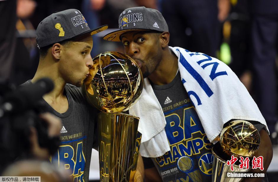 北京时间6月17日上午,NBA总决赛第6战在克利夫兰速贷中心打响,最终勇士客场105-97取得G6胜利,总比分4-2击败骑士,时隔40年后再度问鼎总冠军。图为库里与伊戈达拉亲吻奖杯庆祝胜利。