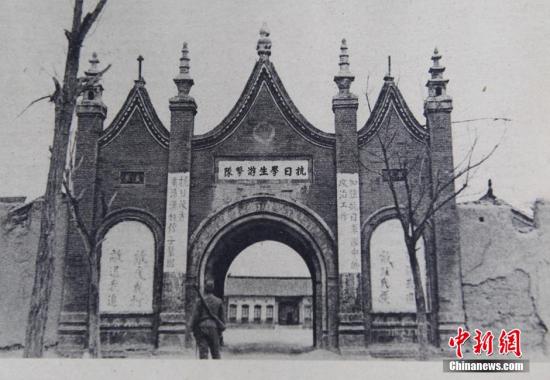 资料图:图为日军1938年拍摄的位于临汾的抗日学生游击队学校,一名日军观看学校大门上的宣传文字。(上联:加强抗日军队中的政治工作;下联:肃清汉奸份子巩固抗日后方。右:敌进我退,敌驻我扰;左:敌疲我打,敌退我追)(翻拍图片) 中新社发 周毅 摄