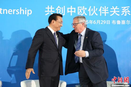 当地时间6月29日下午,中国国务院总理李克强在布鲁塞尔与欧盟委员会主席容克共同出席中欧工商峰会,并发表主旨演讲。中新社记者 刘震 摄