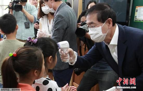 资料图片:当地时间2015年6月17日,韩国首尔,韩国首尔市长朴元淳为小学生量体温,预防MERS疫情。