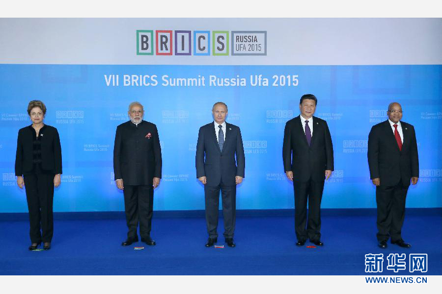 7月9日,金砖国家领导人第七次会晤在俄罗斯乌法举行。中国国家主席习近平、俄罗斯总统普京、巴西总统罗塞夫、印度总理莫迪、南非总统祖马出席。这是习近平主席出席大范围会议。新华社记者 饶爱民 摄