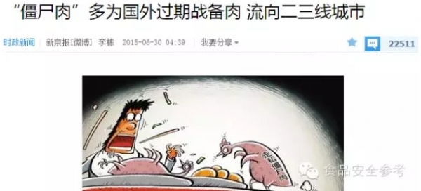 从这里开始,“僵尸肉”的说法迅速传开,舆论被引爆了,新京报、南方都市报等媒体都有跟进报道,还引用业内人士的话,说得有板有眼。后来央视、人民日报也加入了进来。