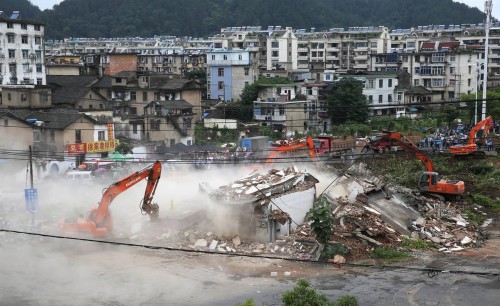 按照城市规划建设要求,黄山市政府对屯溪仙人洞路棚户区城市改造过程中,对城市老屋拆迁未与开发商达成补偿协议的屯溪新园路63号樊某家霸道3年的“钉子户”,实施拆除。图为2015年7月9日,在黄山市新园路与仙人洞路口拍摄的对霸道3年的“钉子户”家实施现场拆除。