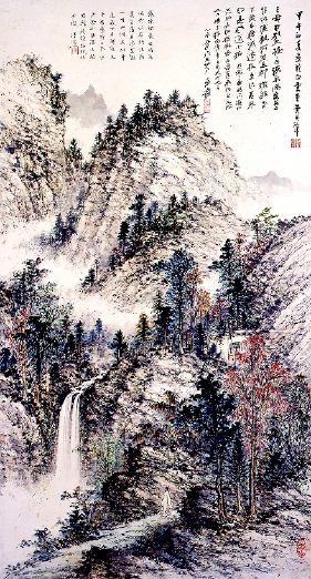 陈履生说,有古人和自然为师,又有当代国画大师们亦师亦友的帮衬,加之黄君璧先生过人的勤奋和才智,使其在抗战八年居蜀时期的艺术得到了长足的发展。著名国画家俞?;诳戳怂庖皇逼诘淖髌氛估乐蠓⒈砥缆鬯担?ldquo;吾友黄君璧幼耽绘事,长益精进,虽籍隶广东,而豪无岭南派习气,其人豪爽俊迈,有河朔气象。所作山水从龚半千之厚重,泽以石溪之古雅,和以石涛之奇肆,酌以田叔石田之挺拔,而上追之黄鹤山樵之繁密,不懈而及于古。近几年来已取董巨之秀润、李范之峻峭、荆关之雄伟阔大于一炉而治之,其得于古人者如此其博且高,久且深。”
