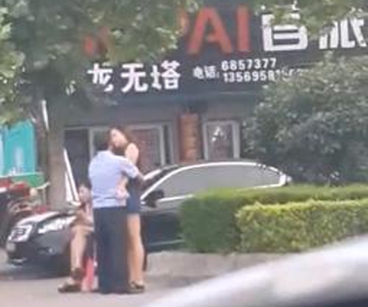 视频显示,两名男性穿着类似执法部门制服在街头与一名女性有亲昵动作,视频中还有另一名女性坐在凳子上。视频32秒处,一名男性抱住该女性并有亲吻动作。从拍摄角度看,拍摄者当时应在不远处的车辆内录下了视频。