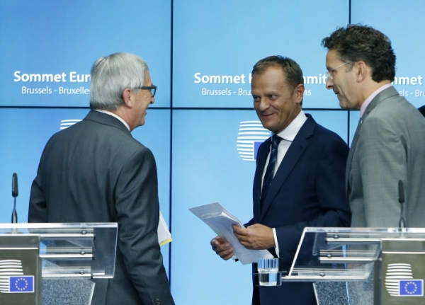 7月13日,在比利时首都布鲁塞尔,欧洲理事会主席图斯克(中)、欧盟委员会主席容克(左)与欧元集团主席戴塞尔布卢姆在出席欧元区领导人峰会的新闻发布会后离开。欧洲理事会主席图斯克当日上午表示,经过了17个小时的谈判,欧元区领导人峰会终于就希腊债务问题达成协议。希腊及数个国家议会需在14日或15日前通过刚刚达成的这项协议,以便重启相关谈判。新华社记者周磊摄