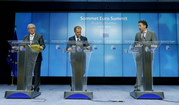 7月13日,在比利时首都布鲁塞尔,欧洲理事会主席图斯克(中)、欧盟委员会主席容克(左)与欧元集团主席戴塞尔布卢姆在欧元区领导人峰会结束后出席新闻发布会。欧洲理事会主席图斯克当日上午表示,经过了17个小时的谈判,欧元区领导人峰会终于就希腊债务问题达成协议。希腊及数个国家议会需在14日或15日前通过刚刚达成的这项协议,以便重启相关谈判。新华社记者周磊摄