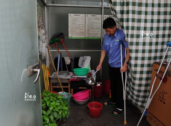 前不久,樊庆考在天桥上打扫卫生时,脚底不慎扎进一颗钉子,住院治疗一个月昨天刚刚出院回家。尽管樊庆考受伤刚出院,但他仍惦记着天桥上的卫生。一会妻子冀凤云就要上天桥打扫卫生了,樊庆考闲不住,非要拄着拐杖先替妻子把水打上。(齐鲁网记者张伟 摄)